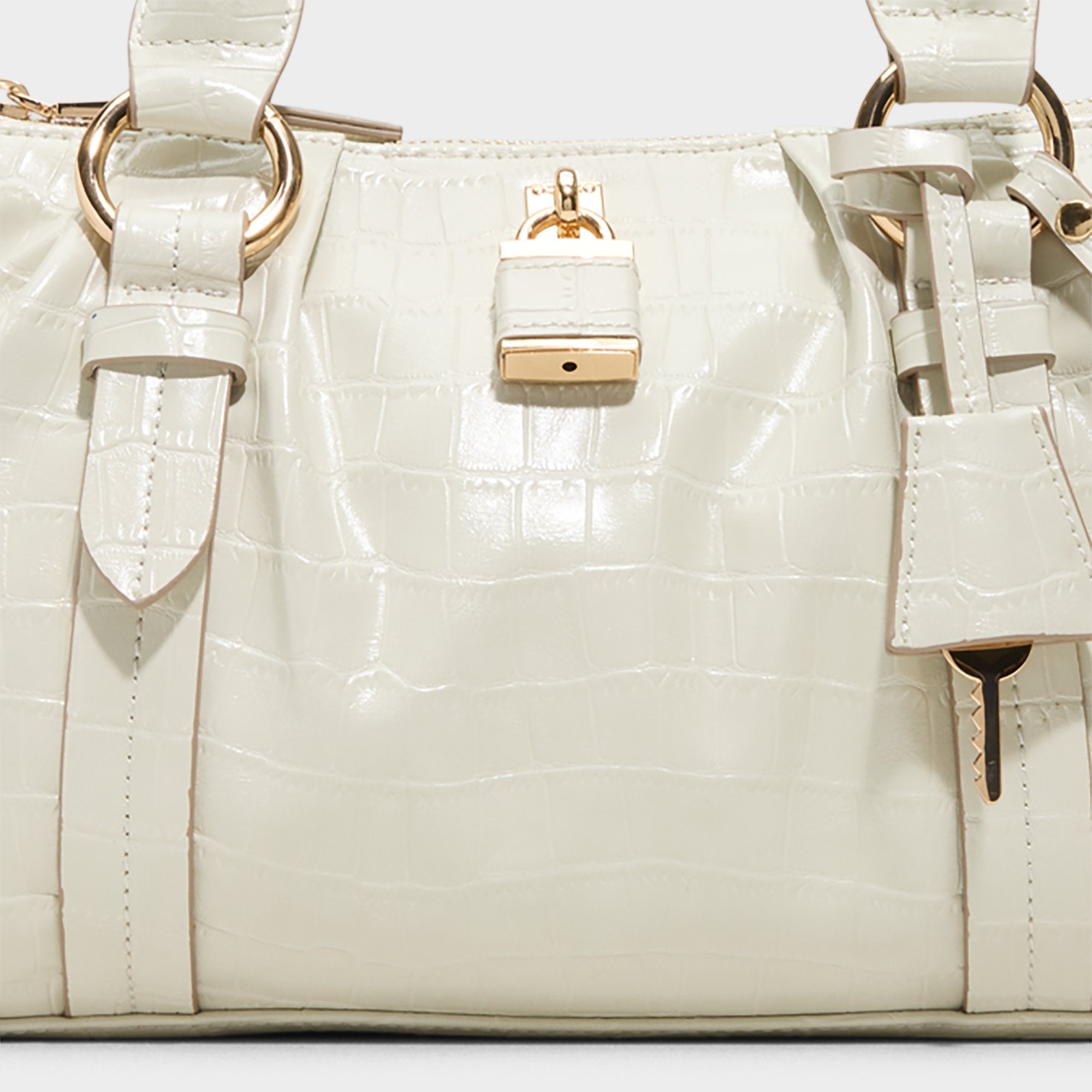 Glossy croc-emboss leather shapes this barrel satchel. accented with gold-tone hardware and a lock-and-key charm that hints at the secure turn-lock closure inside. Carry it to client meetings with a crisp blazer or sling it alongside slip dresses for evening dates to polish the look.