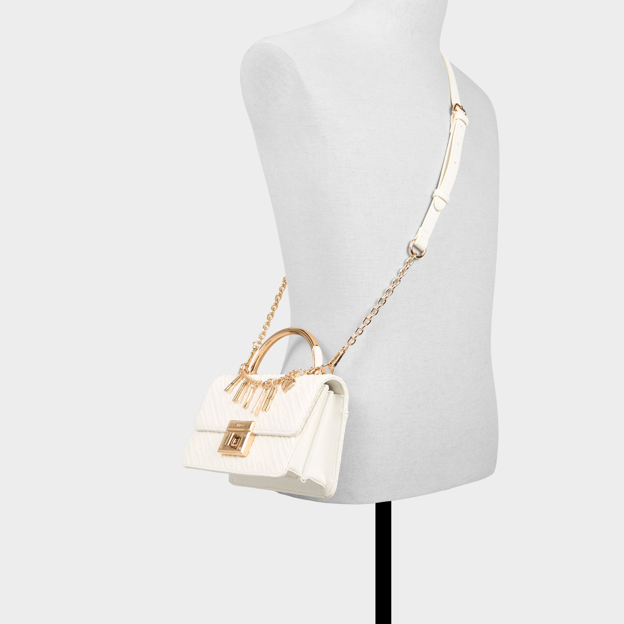 Mini but mighty. this quilted white body pairs with a sleek gold arc handle and a lettered AMOUR chain that adds jewelry vibes while guarding essentials. turning everyday moments into a touch of purse-sized luxe. Carry it with a slip dress for soirees or tuck it under a blazer for brunch dates to finish the look.