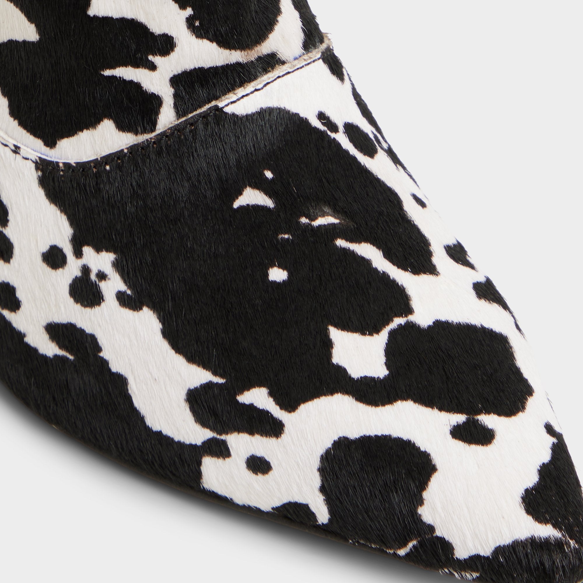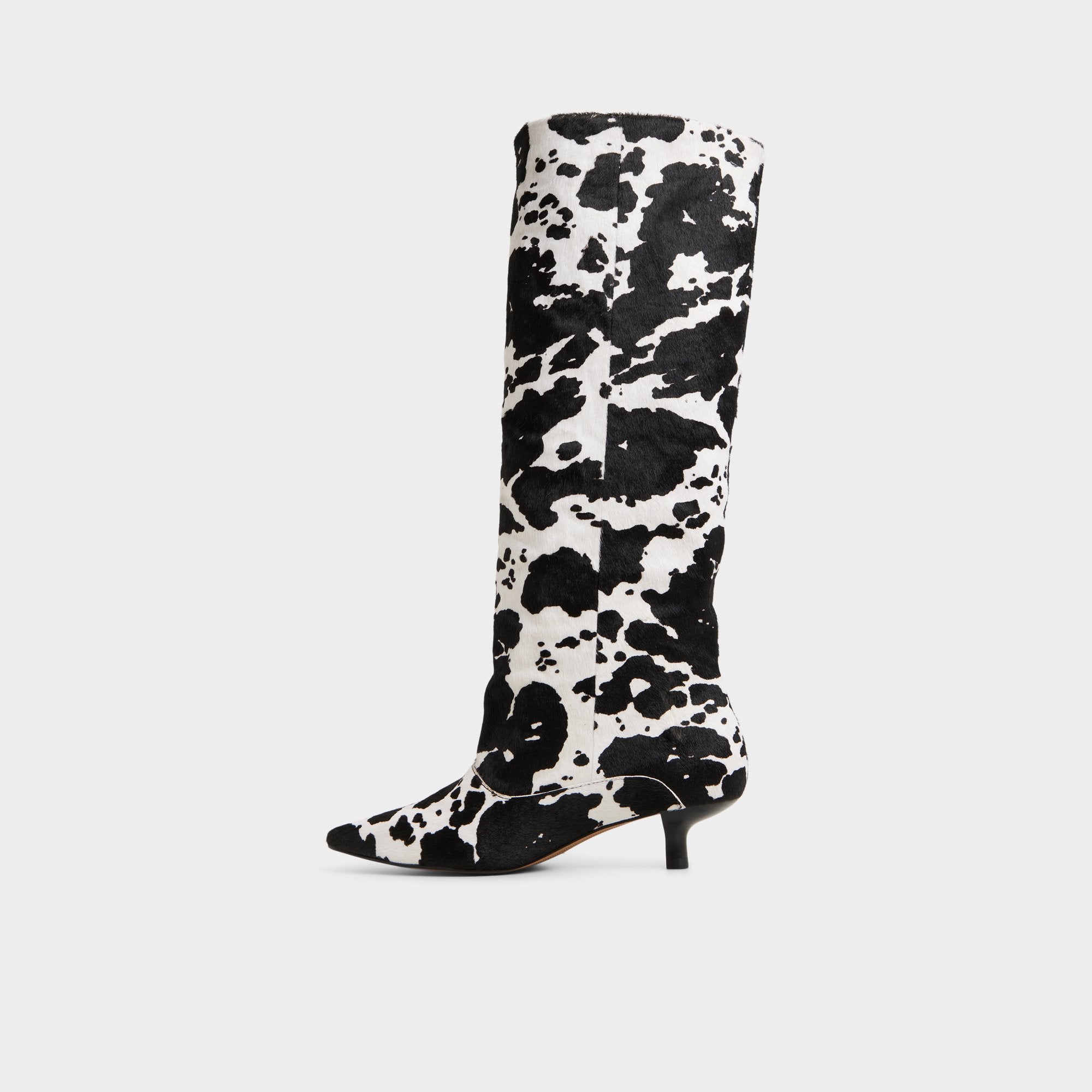 Cow-print faux fur wraps the knee-high shaft while kitten heel and pointy toe keep it bold yet easy. Pair with micro skirt for rooftop album drops or swap into dark-slim denim when gallery hops stretch past midnight.