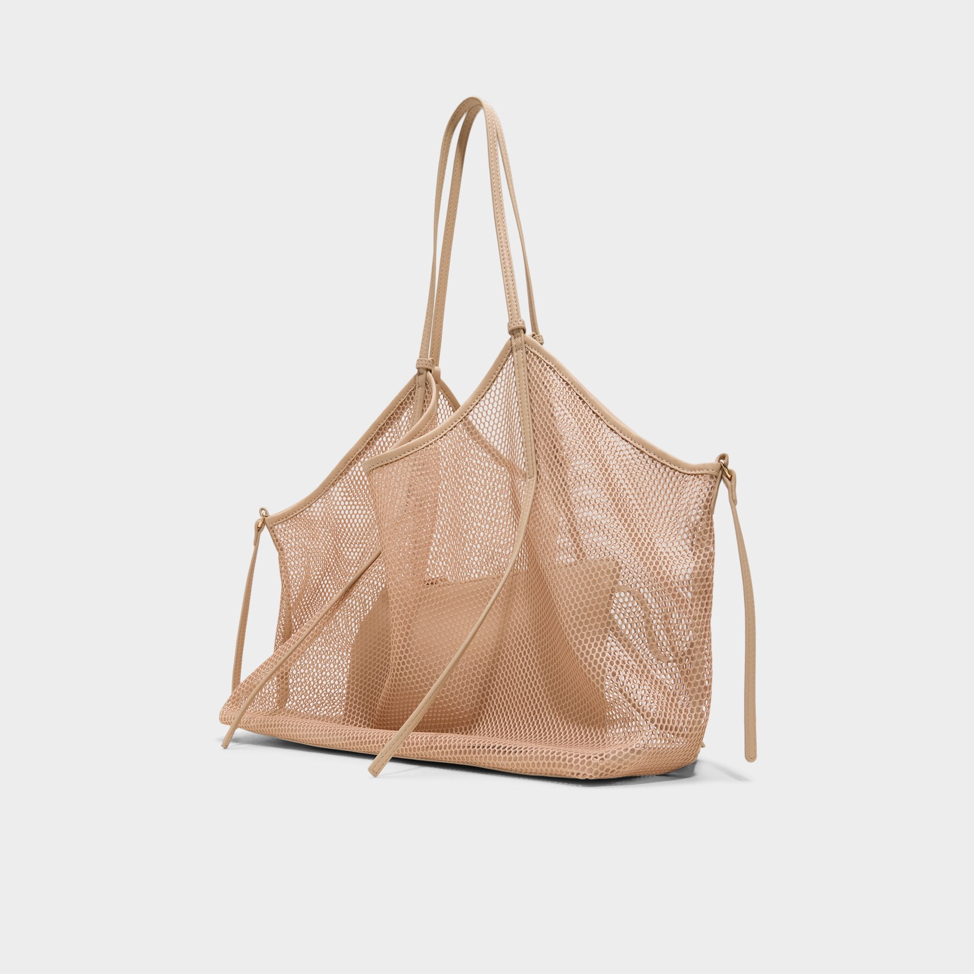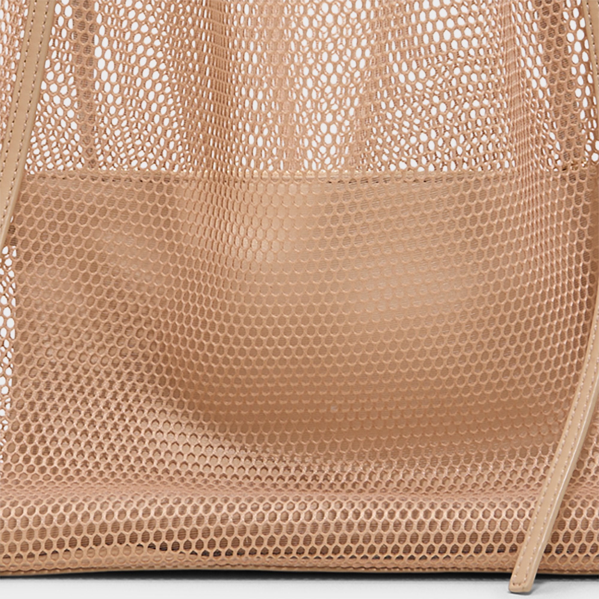 Airy mesh creates a slouchy tote that cinches with drawstring cords. offering space for beach blankets or market finds while gold hardware adds a subtle shine. Carry it with a breezy shirt dress on coastal walks or sling it beside gym leggings for quick city errands.
