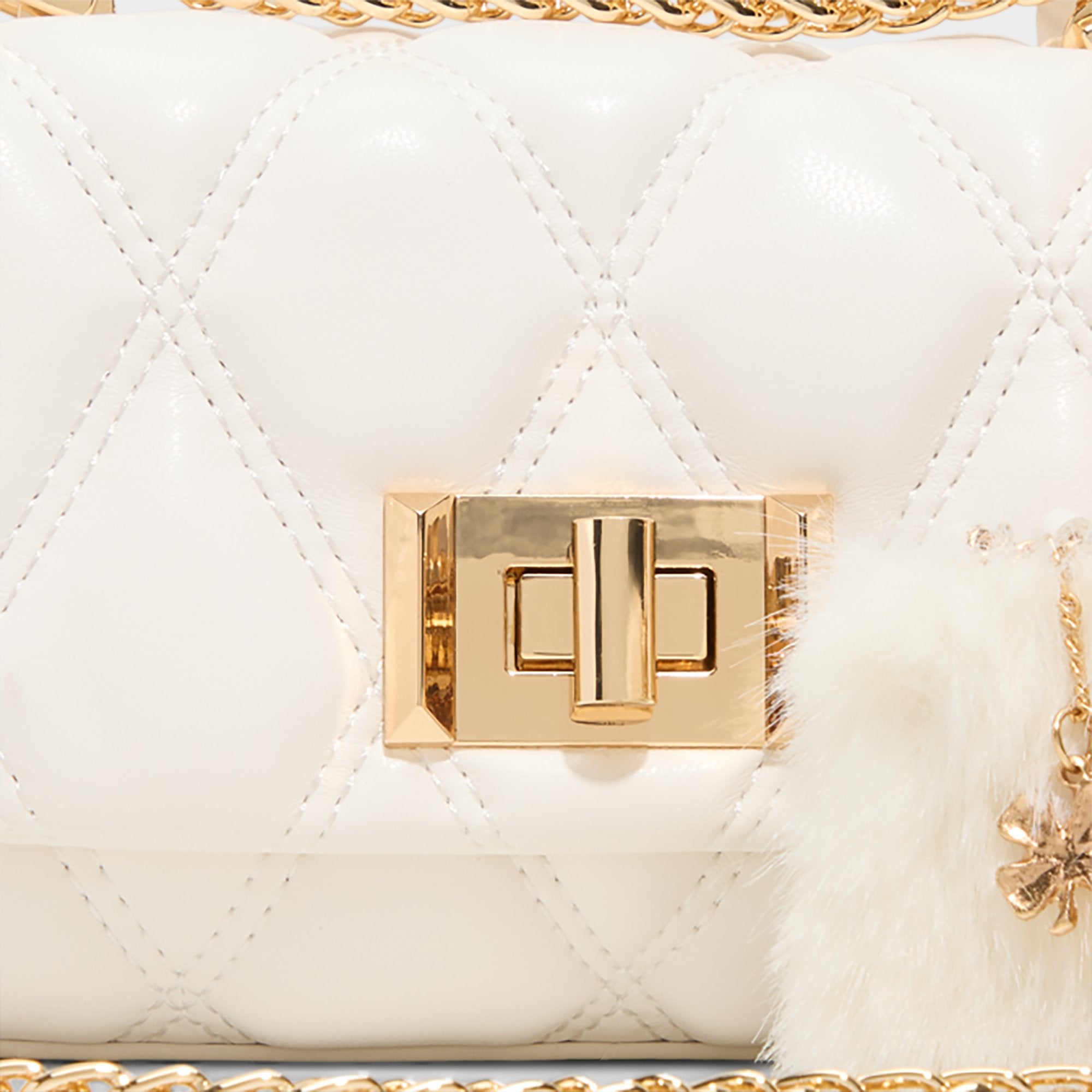 Diamond-quilted leather glows against polished gold hardware. while a plush faux-fur charm adds a playful wink to the secure turn-lock. turning this crossbody into city-chic polish for days that move from meetings to moonlit pops. Carry it with satin slip dresses at dinners or sling it over oversized knits for casual coffee runs.