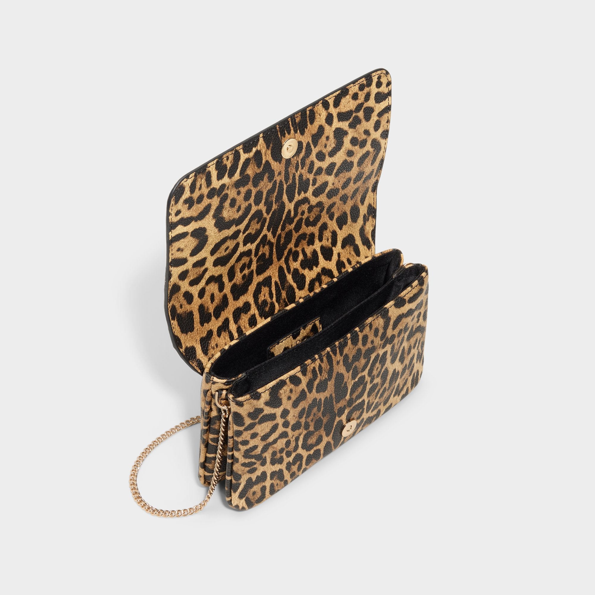 Velvety leopard spots cover this compact flap bag. buzzing with after-dark energy. while a gold chain lets it swing by your side and a snap-shut flap secures the night’s essentials. Pair it with a blazer-dressed jumpsuit for rooftop drinks. or sling it over ripped denim and tees on spontaneous gig runs.