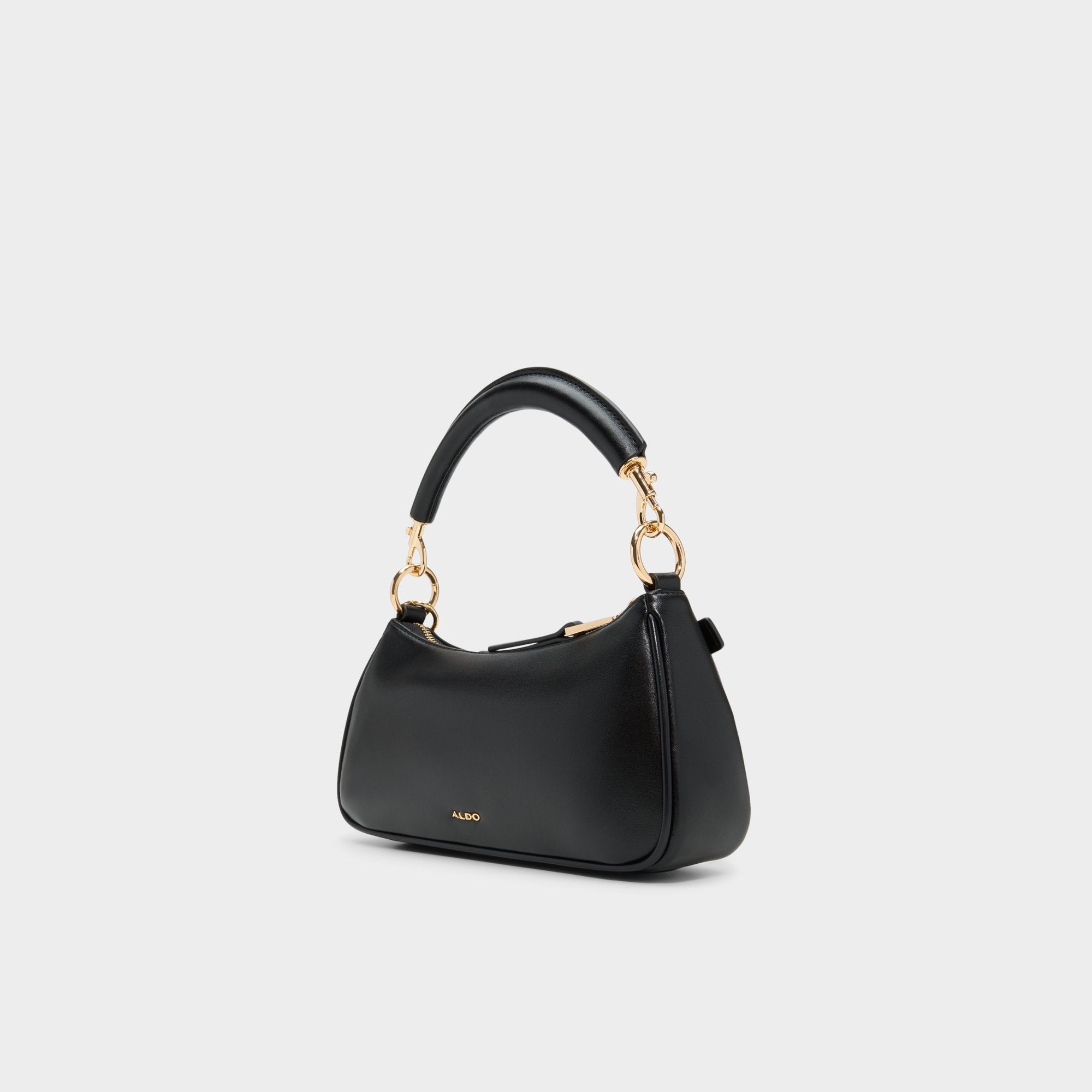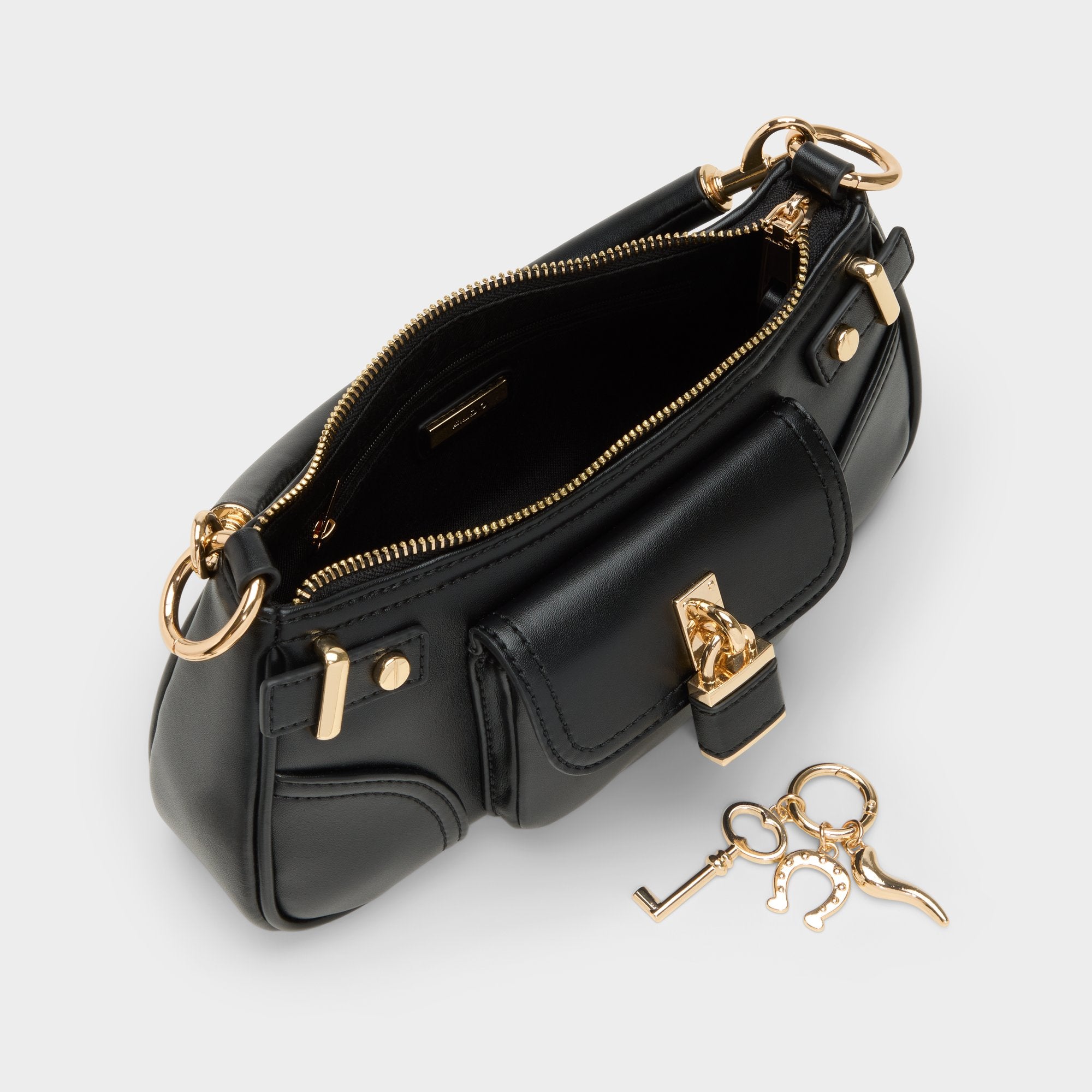 Midnight-smooth leather arcs into a chic baguette shape, with a gleaming push-lock padlock charm stealing the spotlight as the rolled handle threads through golden links, keeping carry polished beneath tailored jackets or worn day-to-night. Carry it with a sharp blazer for meetings or swing it over denim for weekend di