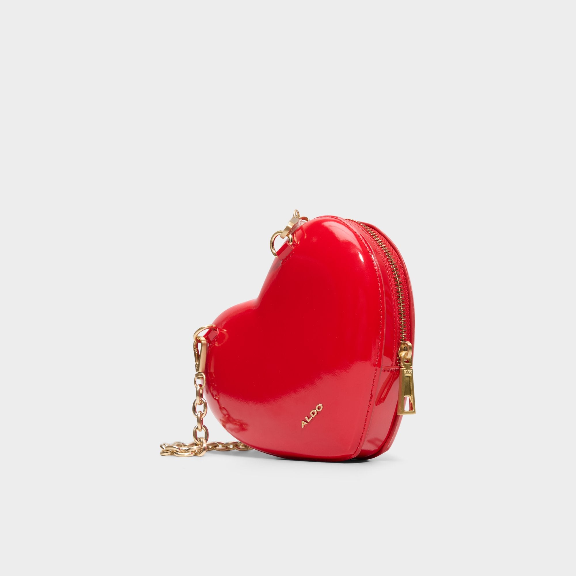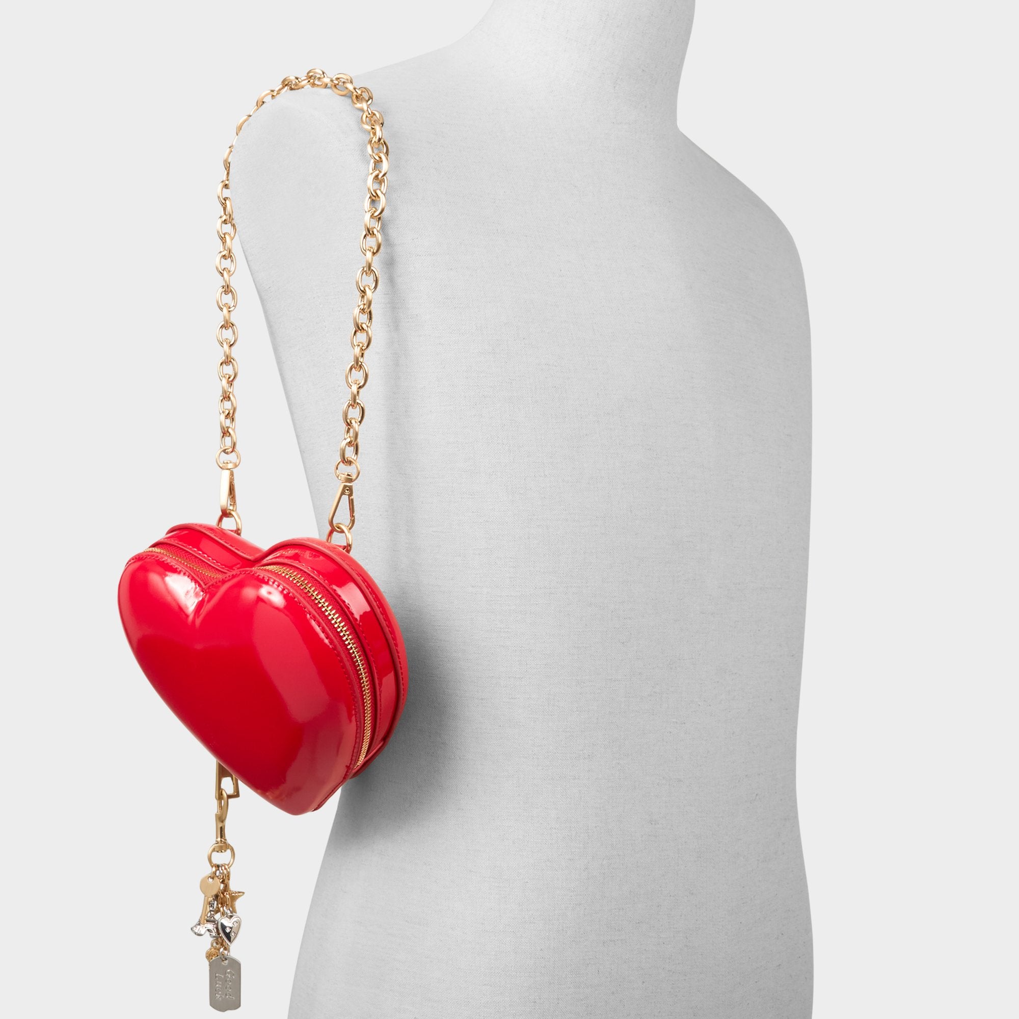 Glossy patent leather frames a candy-apple heart, trimmed with gold charms, while a swingy chain zips open to stow essentials for on-the-go chic that travels from desk to dinner in a heartbeat. Carry it with a satin slip for date night, or sling it over tee and jeans for weekend energy to seal the look.