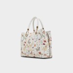 Wildflower illustrations crown this structured tote, where woven handles meet gleaming gold key-fob accents for a visually dominant accent that shifts everyday practicality into a statement piece you carry with ease. Carry it with a pastel suit for office coffee runs, or sling it over a sundress for weekend market stro