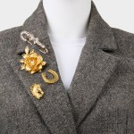 Petal-layered brooches crown a quartet, featuring a sparkling bar, a horseshoe, and a sculpted horse head, adding whimsy to jackets, bags and hats everywhere. Layer them on a blazer for presentations, or cluster all four on a clutch as conversation starters.